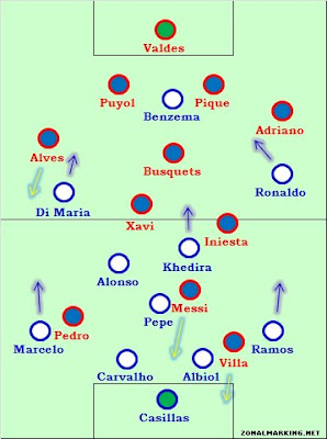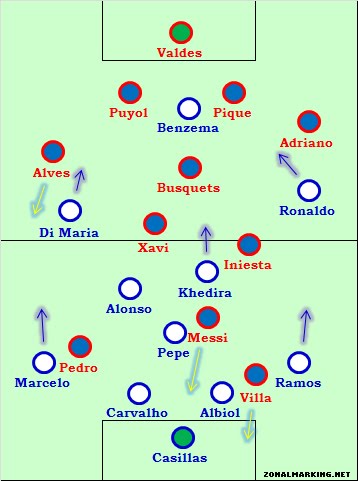 Yo soy Pep y metería a Iniesta de falso 9 y a Messi por la derecha al inicio del encuentro. Messi rondando por la zona de Marcelo y el Madrid entrará en pánico, el Barça vivirá en su banda fuerte, Alves-Xavi-Messi y Pepe se volvería loco con Iniesta de falso 9 con el ‘vengo, toco y me voy’ de Andrés. Con el madrid inclinado a la izquierda conseguiriamos castigar más fácilmente la espalda de Ramos con Villa y tener una llegada de Keita de 2ª línea más limpia y con mucho más espacio. El Madrid, tras pérdida, saldría en tromba por su banda derecha pero con Keita y Mascherano (central zurdo, presumiblemente) se podría controlar más fácilmente.