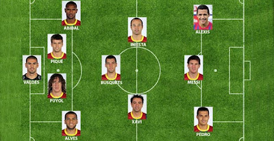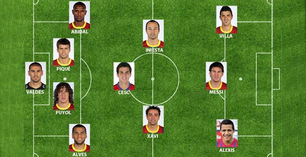 Este once seria el más lógico si no quieres hacer una pequeña revolución y ademas quieres incluirlos a los dos en el once, jugador por jugador, puesto por puesto. Cesc en el lugar de Busquets, daría mayor velocidad al balón, perdiendo posiblemente la capacidad de Busi a la hora de tapar espacios y cubrir espaldas. En caso de Alexis, aportaría más o menos lo mismo que Pedro, tal vez con un punto mayor de técnica individual.