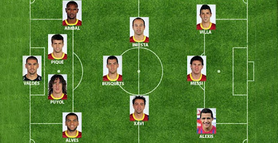 Mismo once que el año pasado, pero con la aportación de Cesc en medio campo, perderíamos a Busquets, mayor circulación de balon, posible perdida de consistencia defensiva.