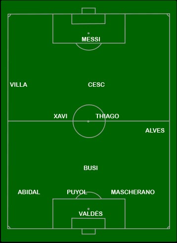 Villa, Pedro y todo el equipo sabían que al guaje le tocaba descansar de inicio. Vamos a ver cómo sale la cosa. La alineación estaba cantada, con la excepción de Abidal, que me habían dicho que estaba tocado.