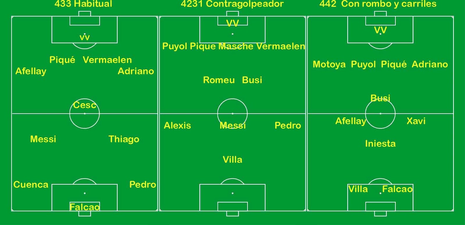 Pero podría ser otro, por ejemplo que viniese ya Neymar como golpe de efecto. Y bajo esta hipótesis, habría otro movimiento de la baraja completamente distinto (central lateral zurdo y alto, etc). O incluso jugar con dos laterales largos abandonando los «extremo Barça» para jugar con dos puntas (Villa-Alexis) que sepan y puedan caer a banda y Messi por detrás junto a Busquets-Cesc-Iniesta. Se buscaría un delantero centro de otro perfil (Llorente, Falcao, Drogba?) al que estamos acostumbrados. Y así sucesivamente.