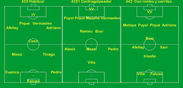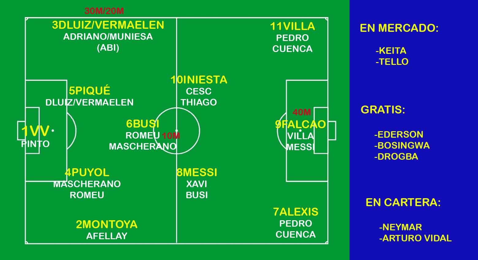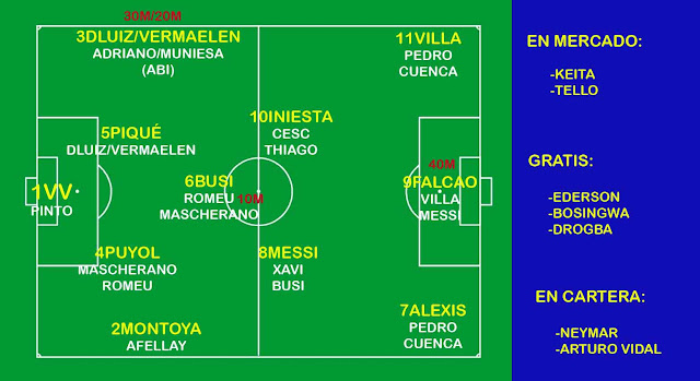 El físico y la llegada de Keita serían reemplazados perfectamente por el físico y la llegada de Martínez. Se haría transición con los jugadores a salir de la próxima temporada para que no salgan mal y sin partidos, además de salir con la Quinta (jejeje): Adriano, Alves, Villa y Afellay. Saldrían por la puerta grande y tendrían buenos recambios a los cuales estos enseñarían (Alba, Montoya para los dos primeros). Para Neymar sería el puesto de Villa y Afellay sería reemplazado por Tello. Este año se buscaría más exhaustivamente un Abidal. Y si ni así el equipo da pie con bola hay Rafinhas y demás que debutarían simbólicamente y además nos darían un abrebocas como Cuenca al comienzo.