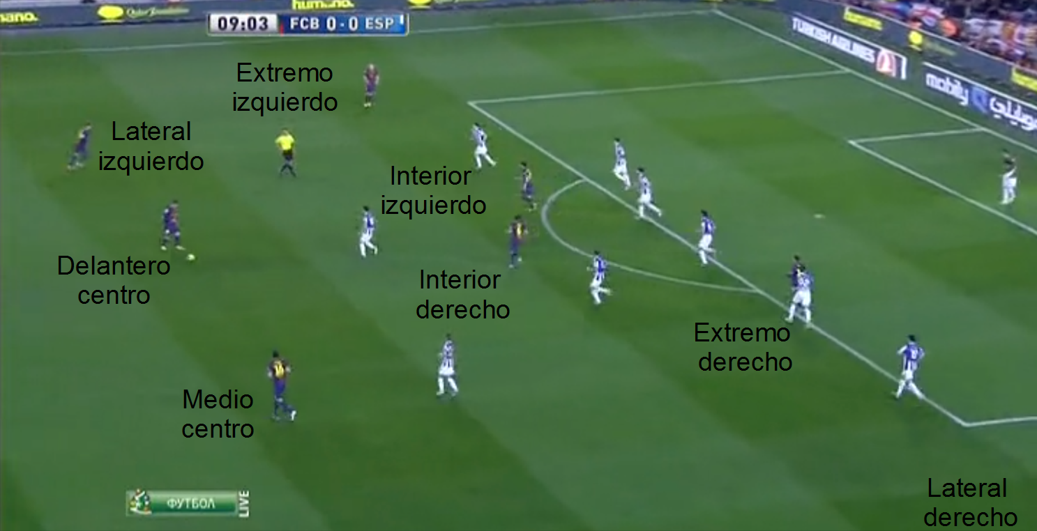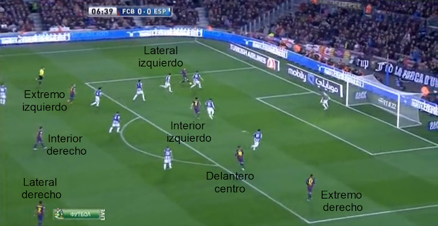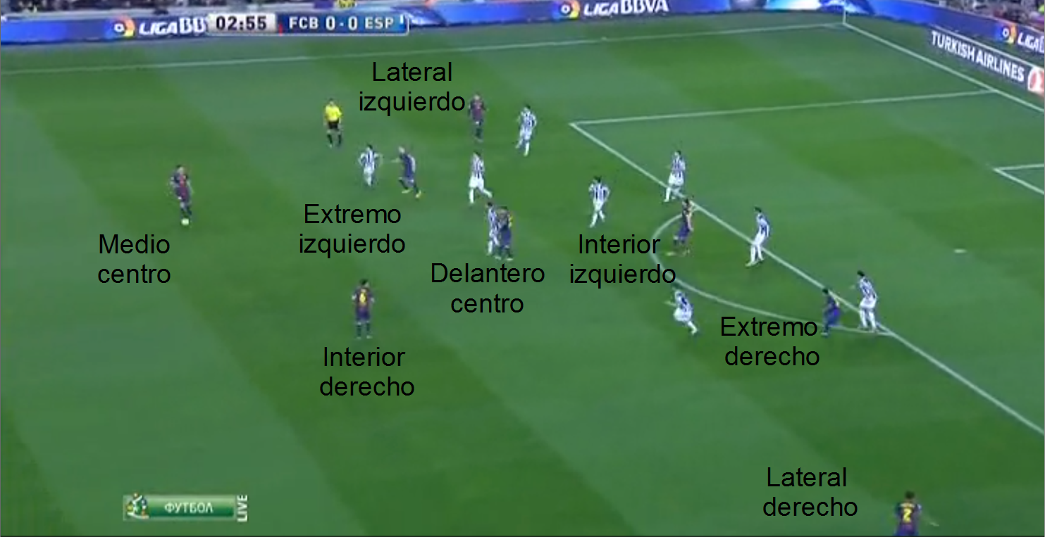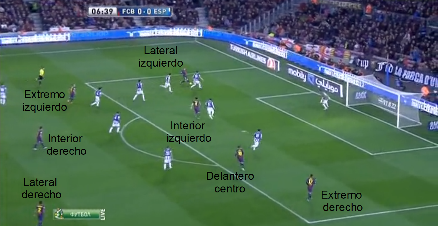 Cuando vemos la misma imagen pero nos centramos en los jugadores del Barça, cuando nos centramos en quién ocupa cada posición, no vemos un equipo de fútbol, los jugadores no respetan sus posiciones de partida, en jugadas sucesivas encontramos disposiciones diferentes, así, el teórico interior izquierdo, a veces actúa de extremo izquierdo, a veces lo hace de delantero centro, en otras aparece junto al medio centro, al teórico extremo derecho es fácil encontrarlo actuando como delantero centro, como interior derecho, o en posiciones retrasadas, y así con todos o casi todos.