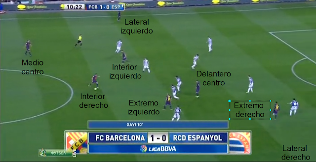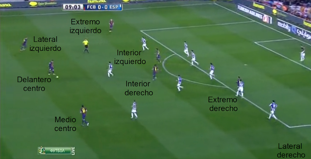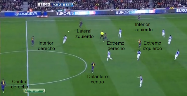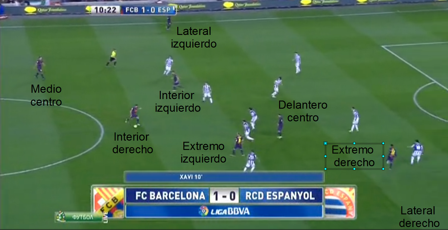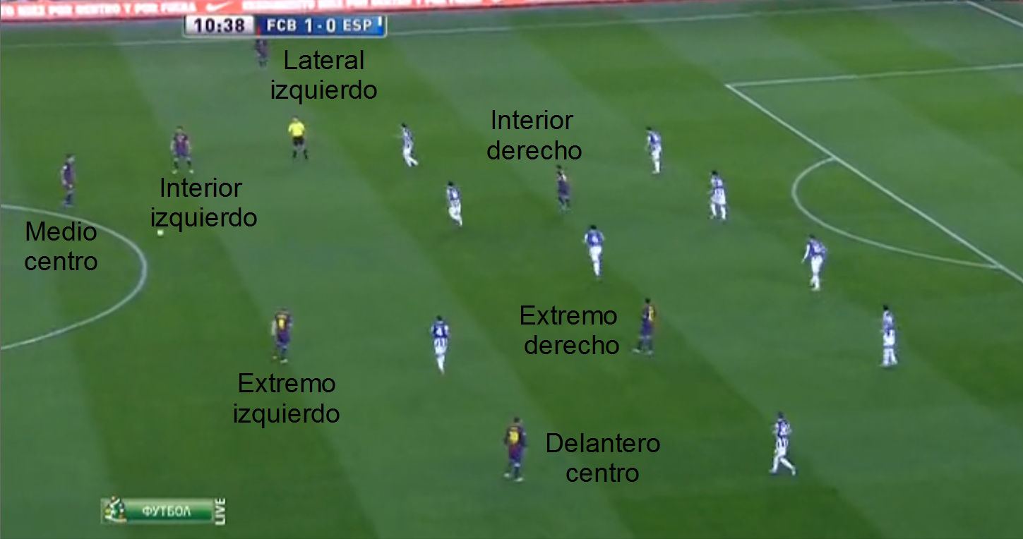 Cuando vemos la misma imagen pero nos centramos en los jugadores del Barça, cuando nos centramos en quién ocupa cada posición, no vemos un equipo de fútbol, los jugadores no respetan sus posiciones de partida, en jugadas sucesivas encontramos disposiciones diferentes, así, el teórico interior izquierdo, a veces actúa de extremo izquierdo, a veces lo hace de delantero centro, en otras aparece junto al medio centro, al teórico extremo derecho es fácil encontrarlo actuando como delantero centro, como interior derecho, o en posiciones retrasadas, y así con todos o casi todos.