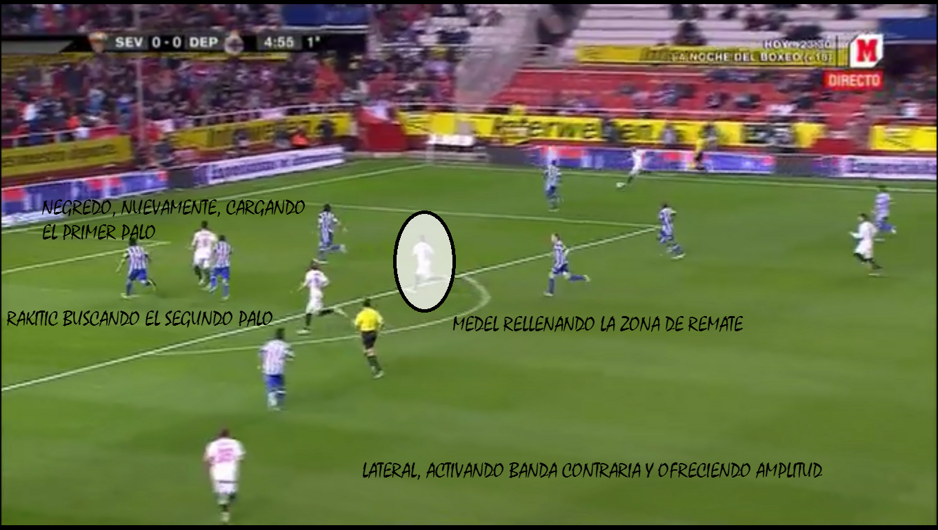 En ese juego de bandas, Rakitic, hombre clave del sistema de juego -jugador más en forma de la plantilla sevillista- naturaliza sus decisiones en torno a dos movimientos, que tienen su relación según la jugada sea un robo y transición rápida o una salida más pausada. En robo, busca percutir por dentro para, aprovechando desmarques de Negredo al primer palo, ofrecer un remate en el segundo. En juego posicional Rakitic combina la participación interna, situándose en zonas cercanas a la base de la jugada, con las caídas a banda en combinaciones con un Reyes que, al tener condiciones para retener la pelota, le ofrece tiempo para aprovechar su pase vertical.