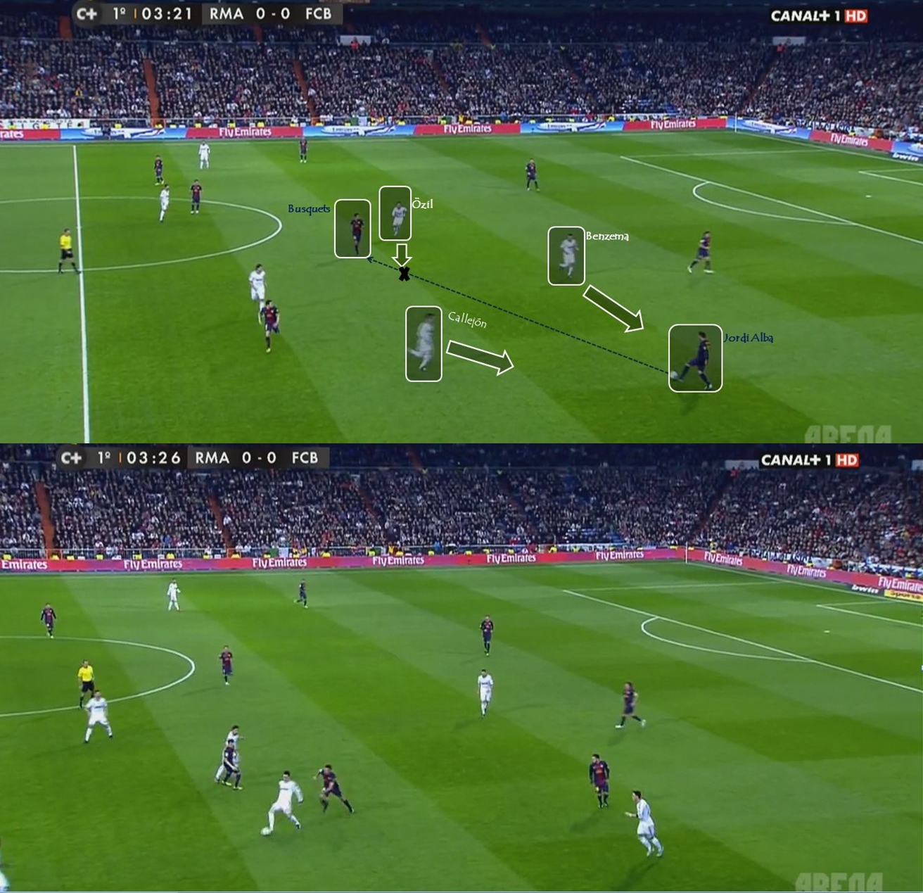 El plan de siempre: inicio fuerte, presión, provocar pérdidas, no dejar que el Barca entre en el partido, y con suerte ponerse por delante. A partir de ahí bajar un poco el pistón, y buscar las contras con Ozil o desplazamientos en largo hacia Cristiano.