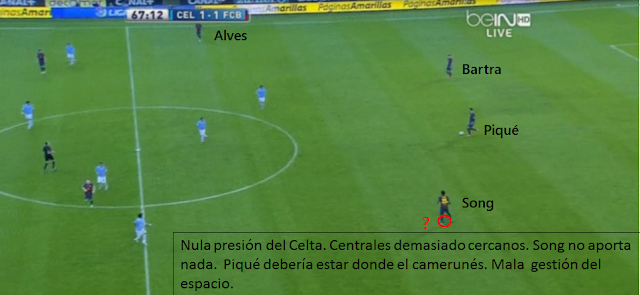 Partido ‘típico’ el de ayer, post-selecciones, pre-champions y lleno de suplentes contra un equipo que se juega la vida, no hay que olvidarse del contexto. Me gustaron Montoya, Bartra y Song (aunque estos dos fallen en el 2o gol del Celta, tal y como se ve en la imagen). Thiago no jugó un gran partido pero tampoco jugó tan mal, perdió algún balón pero lo intentó…pero es que estaba totalmente solo en la creación, dónde estaba Cesc? Gran culpa del partido de ‘aprobado justo’ de Thiago fue por Cesc, ayer fue el partido que ha colmado mi paciencia con Fàbregas. Después de apenas jugar con la selección, descansado, tiene este partido para dar un golpe en la mesa, la posibilidad de reivindicarse para París,…y es que no toca la bola, porfavor…ayer era un partido que, por su calidad, tiene que liderar y ganar el y sigue sin hacerlo…en fin, me está empezando a defraudar.