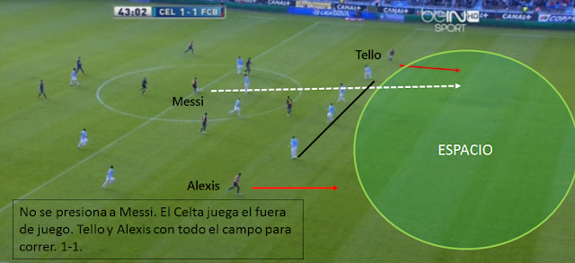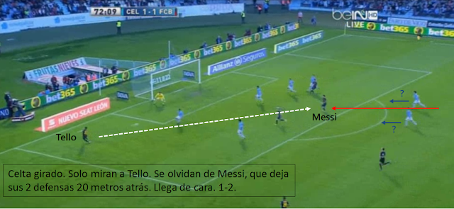 9- Pero sin presionar con ganas al portador y dejando mucho campo a velocistas, la sanción llega tarde o temprano. Sobre todo si hablamos de Messi y Tello. El canterano tiene el gesto de Thierry Henry. 1-1 en el minuto 42.