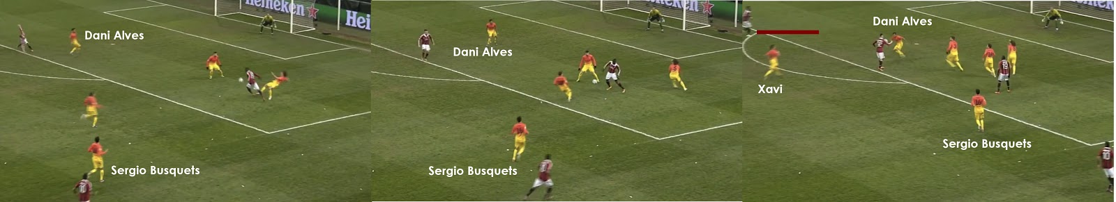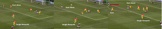 Y aquí descubrimos el pastel. En estas situaciones, lo normal es que sea bien el mediocentro, bien el interior del lado más alejado del balón, quien en este momento se incruste en la defensa para recomponer el equilibrio. La cosa quedaría así: lateral izquierdo sobre el rival que tiene el balón, central izquierdo haciendo la cobertura, central derecho y mediocentro formando la nueva pareja de centrales. El lateral derecho -el más alejado-, pues, aquí sí, cubre el segundo palo. Otra solución pasaría porque efectivamente sea el lateral el que se incruste dentro y recaiga en el interior (o el volante si el equipo juega en 4-4-2) la defensa de su espalda. En el Barça, sin embargo, Busquets no puede llegar porque como hemos visto unos instantes antes ha tenido que acudir al costado, y Xavi tampoco porque ni siente ese movimiento ni su físico se lo permite ya hacer.