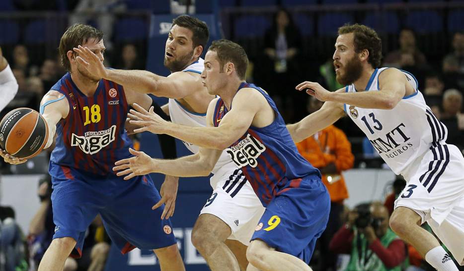 F.C. Barcelona Regal – Real Madrid (67-74) – Semifinal – Euroliga El Real Madrid de la mano de Felipe Reyes y Sergio Rodríguez superó al F.C. Barcelona Regal alcanzando la Final de la Euroliga, trás 18 temporadas, para enfrentarse al Olympiacos y reeditar la Final de Zaragoza (1994/1995) donde el conjunto merengue sumó su octavo título continental. El F.C. Barcelona Regal muy mermado por las lesiones luchó hasta el final. El conjunto blaugrana llegó a disponer de una máxima ventaja de nueve puntos (61-52) a falta de 07:28. Un parcial de 6-22 para el Real Madrid con un pletórico Felipe Reyes (11 puntos) sentenció el encuentro. Primer cuarto de claro dominio del Barça Regal con una máxima ventaja de siete puntos (13-6) destacando Tomic y Navarro ante un Real Madrid fallón en el tiro. Remontada del Real Madrid en el segundo cuarto con Sergio Llull (11 puntos) y Sergio Rodríguez (7 puntos) para llegar al intermedio con una ventaja de seis puntos (33-39). El tercer cuarto destacó por la baja anotación de ambos equipos (18-9) finalizando con ventaja blaugrana (51-48). El Barça Regal aprovechó la inercia del tercer cuarto para alcanzar su máxima ventaja (9 puntos; 61-52) en el inicio del último cuarto. Los últimos siete minutos de partido fueron una losa para el Barça Regal lastrado físicamente para encajar un parcial de 6-22 con Felipe Reyes y Sergio Rodríguez como auténticos baluartes de la victoria madridista.
